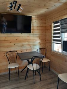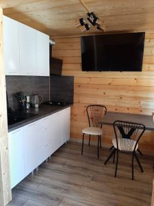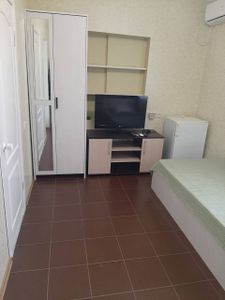 здесь также вешалка для одежды и телевизор. Кухня просторная. и тоже с телевизором и кондиционером. Холодильник среднего размера - все запасы продуктов легко умещаются. Есть микроволновка, эл.плитка, чайник. Посуда всякая в ассортименте имеется. В ящике лежат пакеты для мусора. Как дома - всё под рукой.